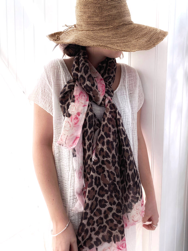 Naturals • 70 x 180cm Soft 45% Linen / 55% Modal Our classic animal print is surrounded by a border of soft pastel roses giving a summery twist + printed on a soft Linen / Modal.