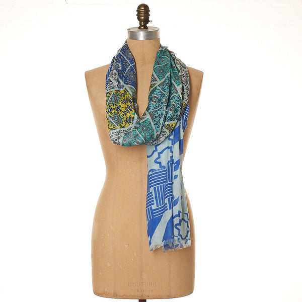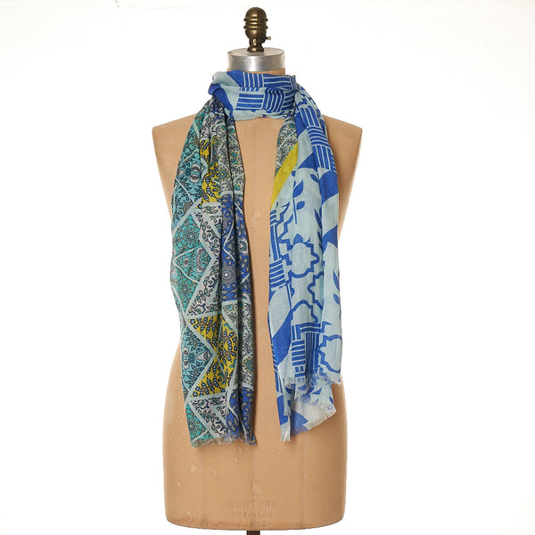 MultiĀ  70 x 180cms Soft Cotton/Modal blend Inspired by the intricate patterns of Moroccan ceramic tiles... a mixed up design in multi blues tonesĀ . Perfect back with denim + a T shirt !
