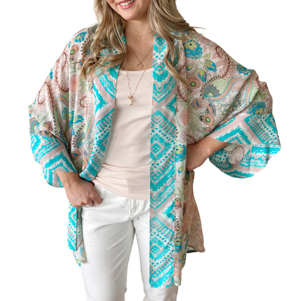 This is a unique digital printed design, in a soft neutral palette with touches of Turquoise  and a feature sleeve border + neck detail  This Cape is designed to be worn in a relaxed way due to its easy loose...