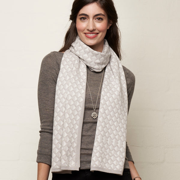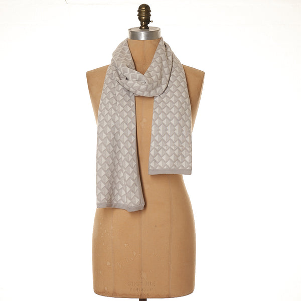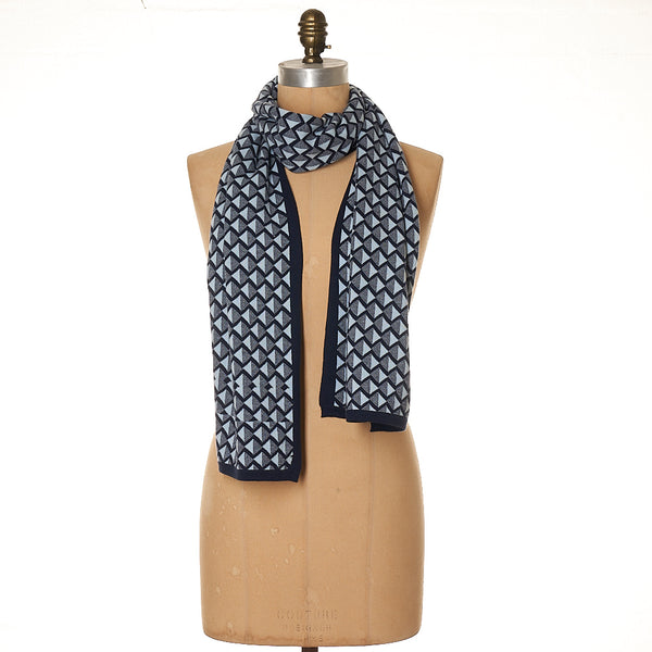 32cms x 180cms Soft 100% Cotton Soft + fine this geo pattern knit mixes two colours to create a subtle pattern - totally reversible for easy wear Soft Grey    Navy