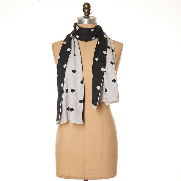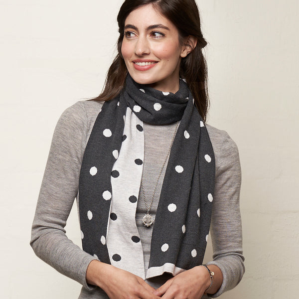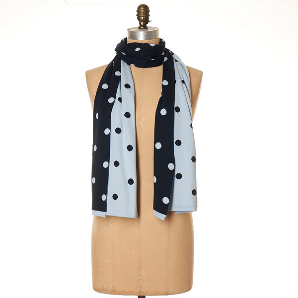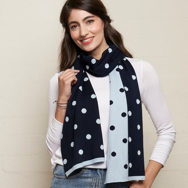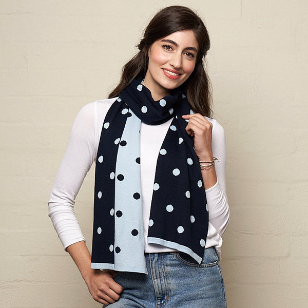 32cm x 180cm Soft 100% Cotton knit  A knitted fully reversible classic dots design -  can be worn either side , so 2 scarves in 1 ! Always such a fave design with our customers. Navy/Blue  -   Charcoal/Grey