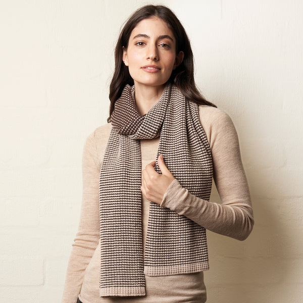 A soft luxe patterned design – two yarns knitted to form a fully reversible design able to be worn on either side. Navy/Grey • Natural/Choc 34 x 180cm Soft 100% Cotton Knit